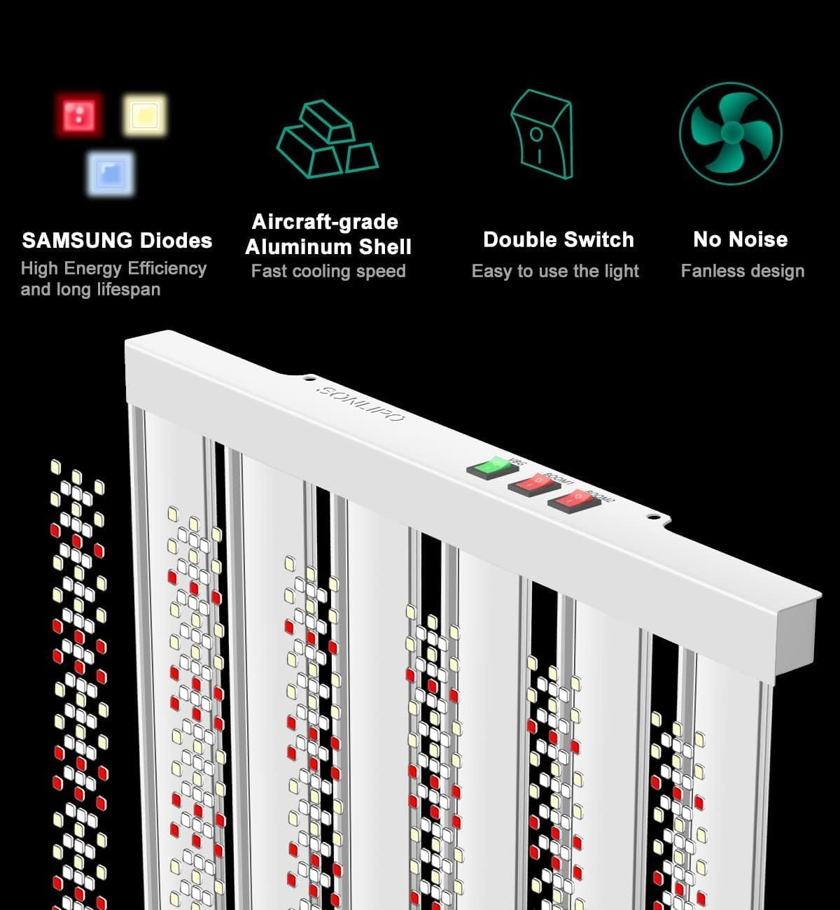 - 【VEG & Double BLOOM Switch】Aaccording to the growth and yield of plants, SONLIPO designed 3 switches, VEG, BLOOM and enhance BLOOM, to facilitate the control of red and blue light spectrum, to make the roots and stalks of plants grow thicker, and prevent them from growing taller in vain. Enhance RED light, can greatly increases the size and number of flowers to maximize the yield of the plant, maximum 2.9 g/w.